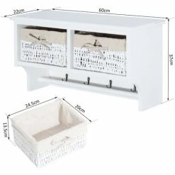 HOMCOM Entryway Coat Rack Wall Mounted Shelf Wicker Basket Hooks2 Baskets White