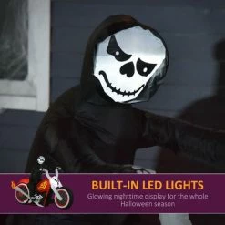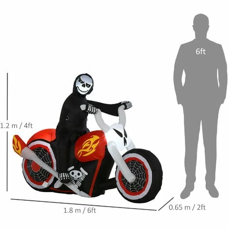 Create the ultimate hardcore Halloween display in your yard this holiday season with this large 1.2m tall badass Grim Reaper By HOMCOM cruising on his chopper from hell while sporting a wicked smile. Made with ultra-durable, weather-resistant, waterproof polyester and featuring an internal white LED glow, this biker will scare trick-or-treaters year after year. Self-inflating in minutes, this display plugs into any standard outlet in a super simple set-up process. Scare your neighbors with this amazing, badass biker. Create a visual statement as he blasts across your yard like a bat-outta-hell, flames shooting from his tailpipes (Bike does not actually move, this is all metaphorically speaking).
