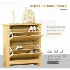 This compact shoe cabinet from HOMCOM will help to keep your home effortlessly decluttered. A particle board construction ensures a tough and solid frame, with a smooth coating so it can be cleaned easily. Two pull-down drawers hold two shelves each, which stores up to 12 pairs of shoes for easy organisation. A groove handle allows you to open and close. An oak-tone top allows extra holding and display space, with feet to keep the unit balanced.
