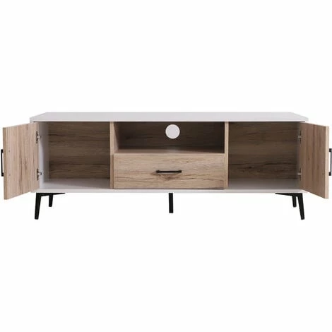 Ensure your TV and other media are kept in style, thanks to this two-tone Scandinavian style TV unit from HOMCOM. Made from a blend of particle board and MDF for durability and strength that can hold up to 25kg. It is crafted into a beautiful design that features two end cupboards, a bottom slide-out drawer and an open shelf in the middle, giving you plenty of storage space for DVDs, electronics and more. This media unit will help you get the most out of your space with elegance and ease.