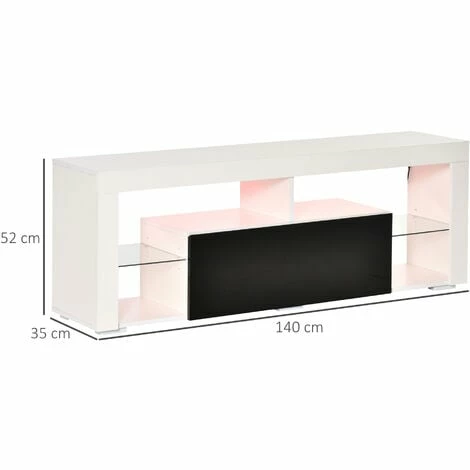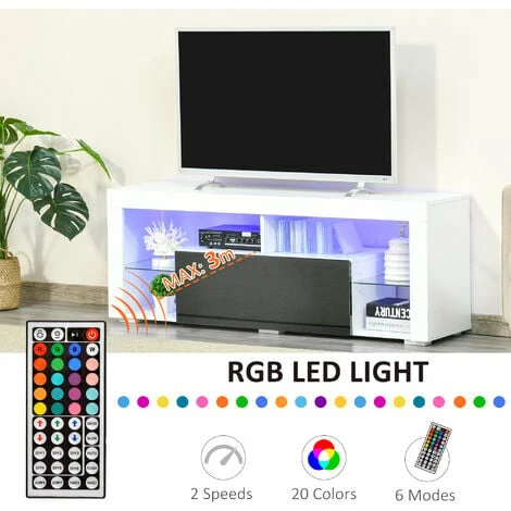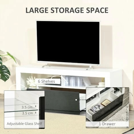 Take HOMCOM TV unit to make your home fashionable! With clean lines and high gloss fronts, this white entertainment unit is stylish and all-match. 20 lighting colours, 6 lighting modes, 2 lighting speeds and DIY colour choices add more exciting elements to your life. Multiple storage space makes your home much cleaner. Besides, the quality particle board will ensure long-term using. This HOMCOM media console is totally a perfect gathering piece and anchor for your living space!