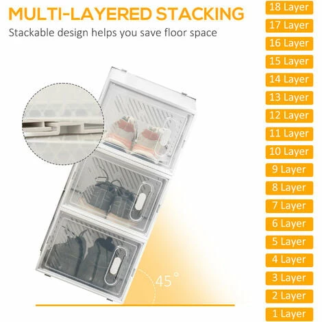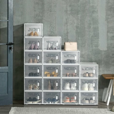 Are you tired of shoes on display and in the closet without any boxes and collecting dust? This clear shoe box from HOMCOM made into a customisable design – 18 cubes that can be set up in any way you wish, a cutout design on top securely stack one box on top of another, making it ideal for fitting into any size and shape space hassle-free. With clear plastic sheets, you can find items quickly. A great piece to your house!