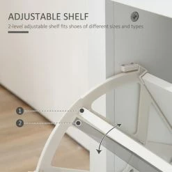 each hold six pairs each, with an adjustable shelf in each for more flexibility. Each tipping shelf comes with two metal handles to open and close easily. White in colour and clean boxy in shape, this piece is modern design which is suited for practically all home interiors. Finished with a flat top shelf.