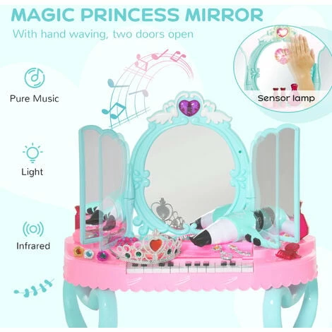 This 32 pcs pretend play set from HOMCOM includes everything a child could imagine in a vanity set. It includes fashion accessories like perfume, lipstick, crown and working hair dryer, which is perfect for children to explore their imaginations. It features a 2-in-1 mode design, with music mode and key mode switched via a function key. In addition, while satisfying the princess dream of children, this set also enhances their developmental skills and encourages them to use their imagination.