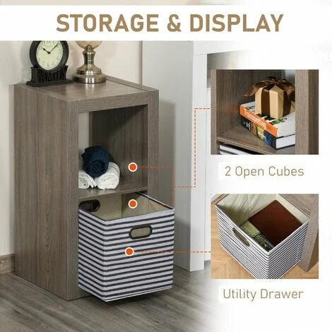 • Features two storage cubes: one open and one with a fabric drawer for discreet storage