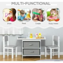 Children can eat, play and relax with this three-piece set from HOMCOM. The matching set of chairs is perfect for playdates, their friends and siblings. It’s their own personal space, where they can keep their toys, books and snacks in the drawers, ensuring your home stays tidy. Made from MDF material, it’s durable and easy to clean, maintaining good hygiene. The soft round edges helps prevent children from hurting themselves. Their own area for endless activities, thanks to this mini set.
