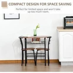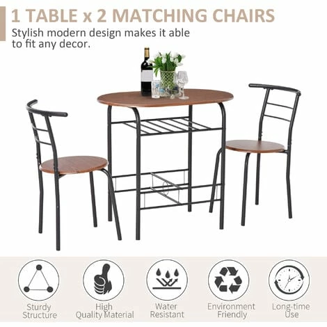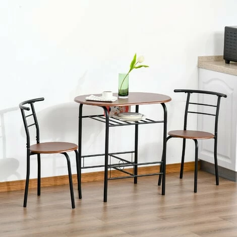 Inject style into your home dining area with this three-piece set from HOMCOM. Made from metal to form a base which is steady and tough, the frame of the two chairs and matching table are crafted into a simple yet chic design, giving the set a timeless look with an industrial twist to blend in beautifully with your existing furnishings. Using high-quality MDF, the rich oak-tone chair seats and table top are sturdy and resistant to water and scratch damage, ensuring they durable for long-term use, with a smooth surface finish for easy cleaning – simply wipe over with a damp cloth. An under-top shelf on the table completes this set, providing room for convenient and easy-access storage. The perfect spot for you breakfast, coffee break and dinners.