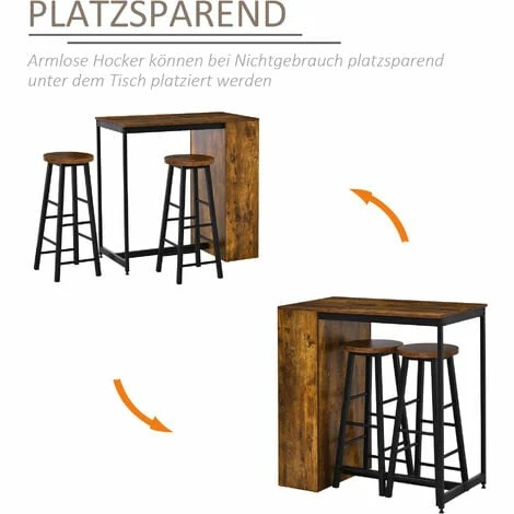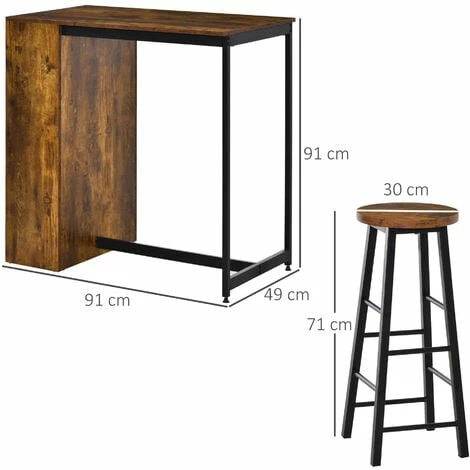 This three-piece dining set from HOMCOM is perfect for small spaces – think flats and studios. Two-tone design, formed of a black metal frame and brown wood-effect table tops for an industrial design to make a modern statement. The stools are tall, armless for freedom when seated. They both tuck under the table, so they don’t take up too much space, with bottom rests for your feet. Table features three shelves on the outside, giving you handy holding room. A cool dining spot for you and friend.