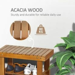 This wooden shoe rack stool by HOMCOM is a great solution to store and organize your footwear. You can store your shoes on the bottom shelves and use the top as a stool seating, which supports up to 80kg of weight thanks to quality acacia wood construction. As a combination of shoe rack and foot stool with vintage style in teak colour, it is designed to be a functional and elegant addition to your bedroom, living room, hallway, corridor and more.