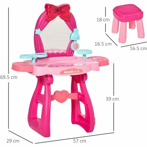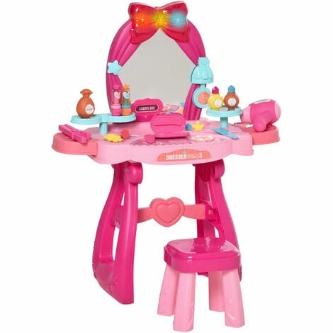 Give your little one their very own fun and cute place to get ready with this dressing table play set from HOMCOM. Included is everything they’ll need to spark their imaginations, including hair dryer, comb, lipstick, ring, hair clip, nail polish, bracelet, hair clip plate, perfume, makeup case, sticker. The table also plays music with a wave of the hand in front of the mirror, and it lights up for a fun and magical feeling. Add some magic and fun to their playtimes with this superb set.