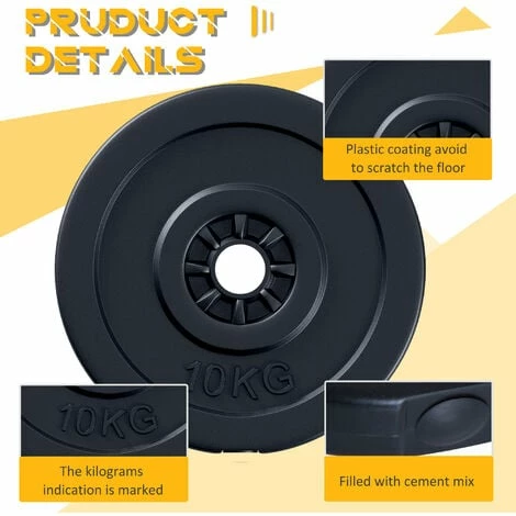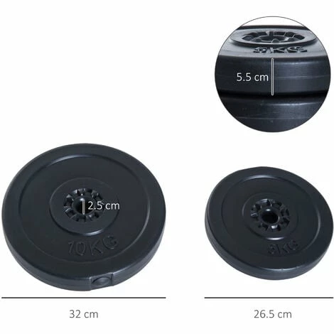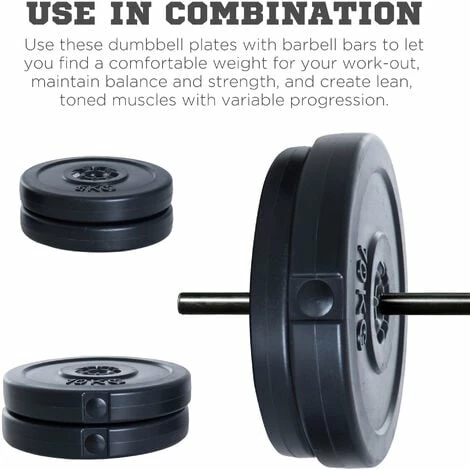 This set of dumbbell and barbell weights consists of two 5kg and two 10kg discs. The different weights can be combined or use individually. The coating of the discs is made of plastic, this allows you to train in silence, without risking scratching the floor. The discs are filled with sand and concrete. This set of discs is specifically designed for muscle strengthening at home or in the gym of biceps, triceps, quadriceps.