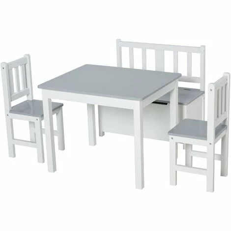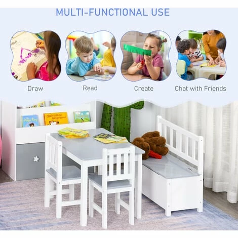 ● Includes 4-piece kids side set, a table, 2 chairs and a storage bench