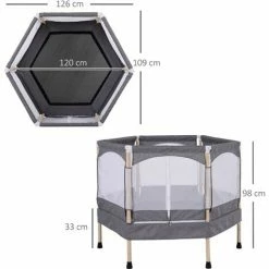 Let them have hours of fun outdoors with this trampoline for kids from HOMCOM. The metal frame ensures stability and strength for a weight up to 80kg, with it crafted into a unique hexagon shape to maximise the bouncing space efficiently, with high-density springs fitted covered with a thick outer edge for safety. With a mesh cover all around the mini trampoline for additional safety, it is finished with a zipped entrance for easy access. Hammer included for easy set up.