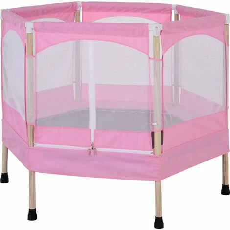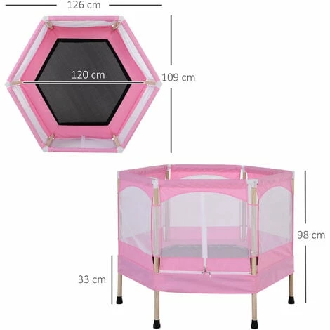 Let them have hours of fun outdoors with this trampoline for kids from HOMCOM. The metal frame ensures stability and strength for a weight up to 80kg, with it crafted into a unique hexagon shape to maximise the bouncing space efficiently, with high-density springs fitted covered with a thick outer edge for safety. With a mesh cover all around the mini trampoline for additional safety, it is finished with a zipped entrance for easy access. Hammer included for easy set up.