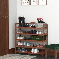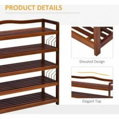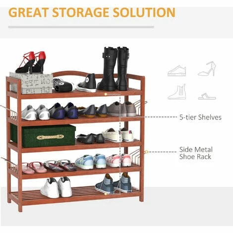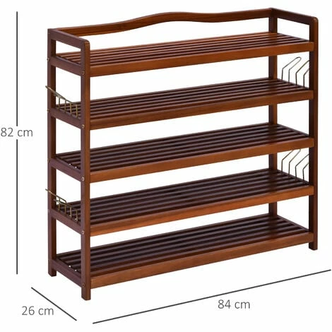 This wooden shoe storage by HOMCOM is a great solution for organising and storing your footwear. Made from Acacia wood in a 5-tier design, the wooden shoe rack is ideal for placing low ankle shoes on the 4 bottom tiers and boots for the top shelf. This shoe shelf also comes with side hangers for your slippers if needed. With a weight capacity of 80Kg per shelf, it can hold up to 25 pairs of shoes. Styled in a vintage look in a teak finish, it adds an elegant touch to any decor of your room.