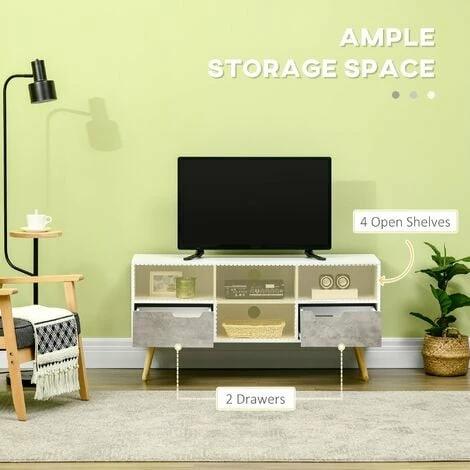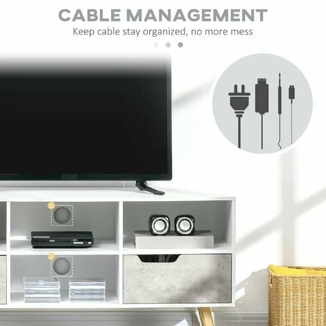 Create a modern centrepiece in your living room, with this HOMCOM TV unit. A new take on Scandinavian style, with grey slate-effect doors adding a point of interest to the design. Features a table top, four shelves and two drawers – plenty of storage for electronics, accessories, magazines, books and DVDs. With two cable holes on the back to keep wires well organised and make your home tidy, it’s finished with four wooden legs for lots of support.