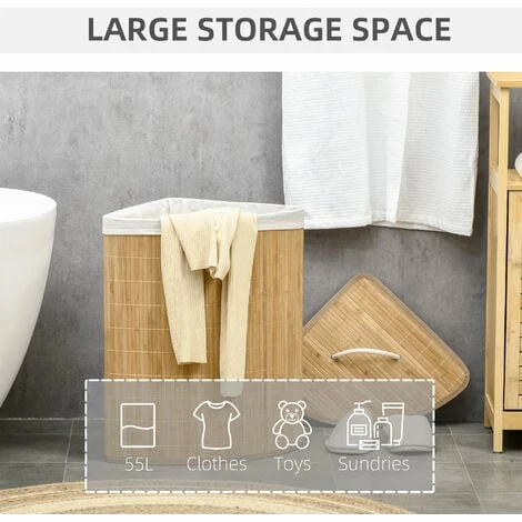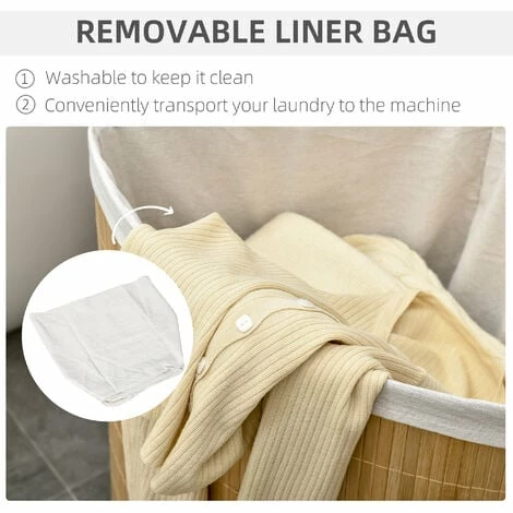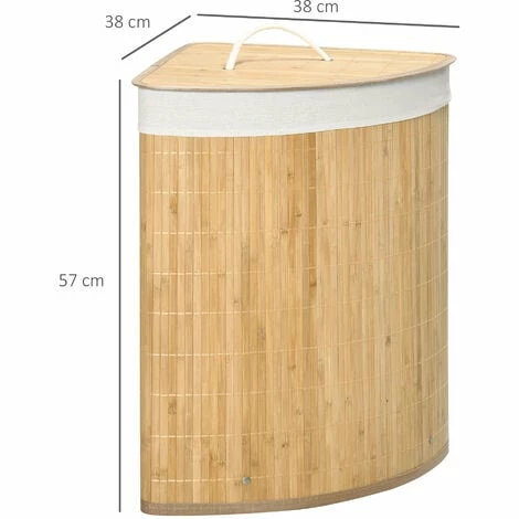 Dirty clothing need never be in the way again. This HOMCOM laundry hamper is an easy way to store your dirty clothes, keeping odours at bay with its bamboo structure and lid. A one compartment design, formed into a triangular shape, makes it perfect for individual use and fitting into smaller corners. The bamboo is naturally breathable and avoids collecting damp. Complete with an easy-lift lid with handle.