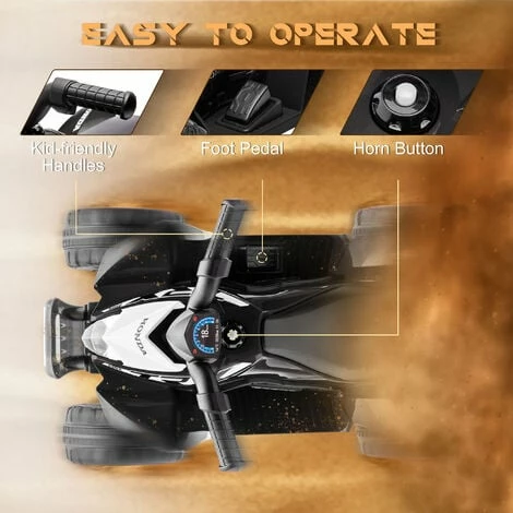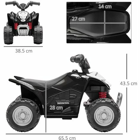 The electric quad bike provides endless fun for children. This HONDA licensed ride-on features headlights, a horn and foot pedal for a realistic driving experience. Four wide wheels keep the ride secure and smooth, whilst they sit on a comfortable seat and grip the soft handlebars. At full charge, this ride-on lasts for 45 minutes – its maximum speed is 2.8km/h, making it safe and appropriate for small children. A great way to make playtime extra exciting.