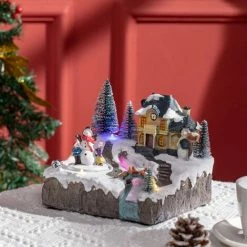 ● Christmas village scene is formed of a house, five trees, snowmen, a fibre optic river and two moving skaters
