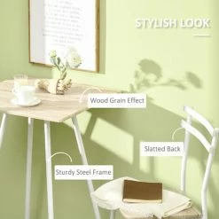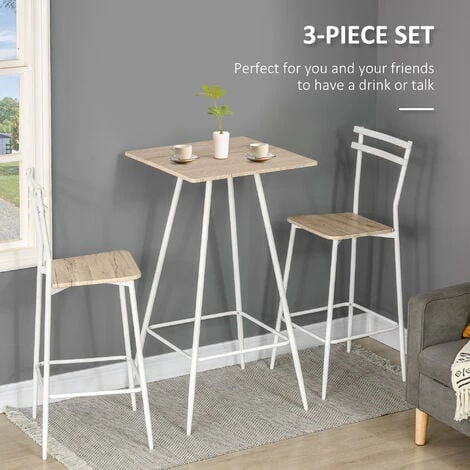 This HOMCOM dining set offers a great place to entertain friends, whenever. Comes with a bar table and two matching stools. Steel frames for strength, with durable MDF seats and table tops for durability, and the wood-effect looks natural and beautiful. Stylish and practical, our small dining table is a great addition to enhance your current home.