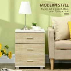 With its modern boxy shape, this bedside table is sure to bring in a lux feel into your nightly routine. It’s formed of three drawers, giving you room for keeping what you need stored within easy reach. Using particle board for the structure, it is solid and tough to withstand everyday use, and is coated with melamine for light protection against marks and stains. Four plastic legs provide complete balance and stability to the unit. A piece to adore for years to come.