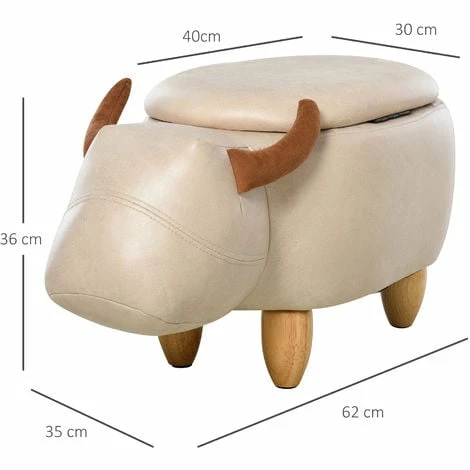 Go wild for this fun and adorable ivory coloured Buffalo storage stool from HOMCOM. Made with a rubber wood frame to ensure it is tough for everyday use, it features a spacious 18x22cm storage compartment, giving plenty of room for keeping books, small toys and other bits neatly together. It is filled with sponge on the outer for safety, with smooth suedette upholstery for easy cleaning. Four wood legs for sturdy balance to the structure and an easy-lift lid finishes this piece.