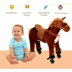 Howdy, partners! This here is the best gift this side of the Mississippi for your little cowboys and cowgirls! Classic style meets modern technology in this plush ride on walking horse from HOMCOM. This fun, interactive toy is sure to bring you smiles and adventures for years to come. Using clever mechanical forward motion technology, by simply pushing down and then releasing the head in a stand- sit motion, the horse is propelled forward across the floor. As the head is pushed down, the front legs and wheels slide forward. When the head is released, the back legs roll forward to catch up, creating forward motion. This plush ride on horse encourages your child to practice balance and coordination as well as creative, imaginative play as they ride this fun toy horse into the sunset. It’s the next best thing to a real pony!