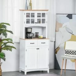 Organize your kitchenware and add more storage space with HOMCOM storage cabinets with doors and shelves. You can use the upper framed glass door cabinet to store plates or display your collections. And the lower cabinet for bigger items such as coffee machine, toaster and wines. Middle drawers can be used to put forks, knives and napkins. And the rubber wood table top offers you a spacious area to place your microwave oven, coffee machine with cable management system.