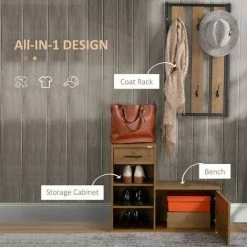 Keep coats, bags, shoes and more organised and all together, thanks to this three-in-one entryway storage set from HOMCOM. Formed of a entryway bench with coat rack, a drawer and a cupboard. The cabinet top is strong enough to support your body weight – a spot to take shoes off and put them on. The answer to an organised hallway starts here.