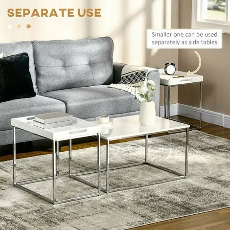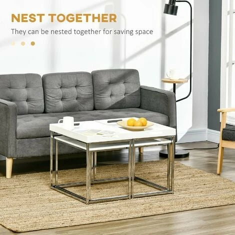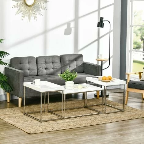Living room style tripled – this set of HOMCOM nesting tables. Comes with two tall tray table top tables, with a lower and wide simple coffee table. Each table comes with a galvanised steel frame for strength