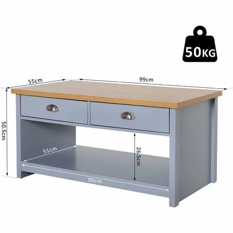 Let rustic charm take centre stage in your living room and home with this wonderful coffee table from HOMCOM. Using MDF in a mid-grey tone for everyday reliability, it is crafted into a rectangular design which features a large open space, two drawers and a natural wood effect tabletop – a great all-rounder for displaying books, plants and photos, whilst keeping everything else discreetly stored away. Elevated on the bottom with four feet to help protect from damage, it also has two easy-hold handles for a sleek finishing touch. A distinctive piece which you’ll love welcoming into your space.