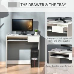 Efficiently save space with this computer desk from HOMCOM. Featuring a keyboard tray and a drawer, it saves a lot of desktop space. Constructed of particle board with oak surface, it’s durable, easy to maintain, and brings you the atmosphere of nature. Its contemporary look will blend beautifully into any style décor. It’s an ideal choice for you to have this desk in your study, office, or bedroom to enrich your furniture while saving space!
