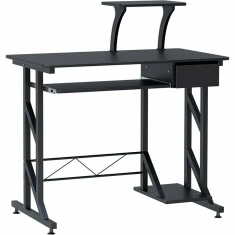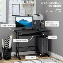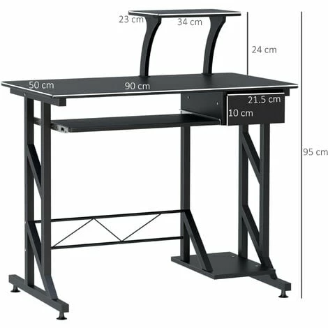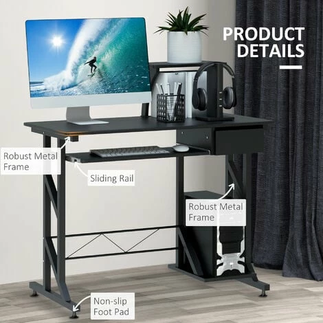 This stylish computer desk is constructed of quality steel and MDF for daily years of use. It has a compact design to use the smallest amount of space, so great for small rooms. Comes with a large workspace, a sliding keyboard tray, a movable elevated shelf, a drawer and a CPU stand for your monitor and daily work items. Equipped with anti-slip feet to make your desk more stable and secure. This modern home office desk is ideal for both home and office.