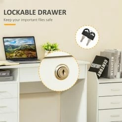two keys included. Compact design great for smaller spaces, particle board structure is sturdy and tough. The desk with storage is finished with handles on the left-side drawers to open and close easily.