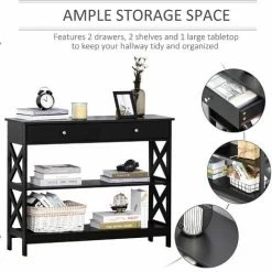 Let the simple style and spacious storage of this console table, from HOMCOM, keep your home beautifully tidy all the time. It’s made from MDF for a solid and durable structure, with back straps to attach to the wall for safety around children and pets. It features two drawers and two shelves, giving you plenty of storage room, with handles on the drawers for a sleek contrast against the block colour. It’s finished with a flat table top for extra holding and display room.