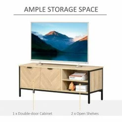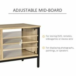 Classic home styling in a subtly striking design. Welcome this TV consolefrom HOMCOM for an appealing and modern statement. Pairs a black frame with a brown wood-effect design on the main cabinet. It features a two-door cabinet and two shelves for generous storage space. Open shelf is adjustable to change the storage size. The metal frame means the core structure is sturdy, with the particle board panels ensuring durability.