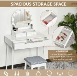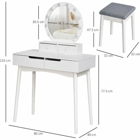 This HOMCOM Dressing table set is a great addition to any bedroom, comes with 4 drawers to keep jewelry, cosmetics or other items in order. large mirror with LED lights makes your makeup more convenient, making it an ideal place for you to get ready. The set is completed with a matching comfortable stool, this elegant and concise styled set is perfect for any bedroom and décor.
