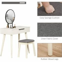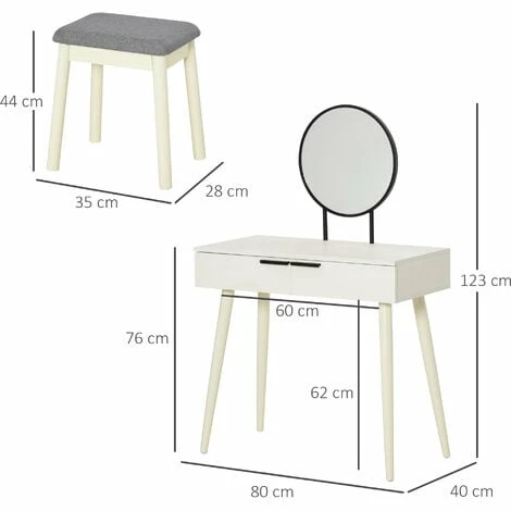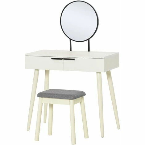 This HOMCOM dressing table has everything you need in one design: elegance, storage and comfort. The set comes with the table and a padded matching stool so you’ll be getting ready at the correct height for the mirror. Two sliding drawers for easy storage of cosmetics, brushes and other products. The table top is flat and large for extra holding room, with a large round mirror for you to get ready. The under-table clearance gives plenty of room for your legs so you never feel cramped.