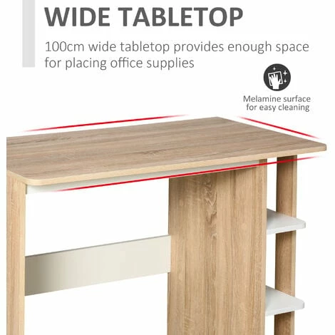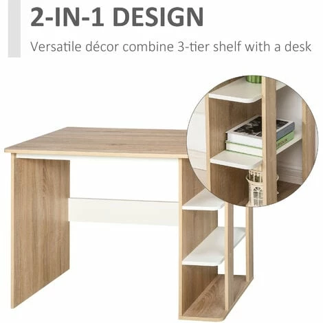 This desk with shelves from HOMCOM brings handy storage to your work space in style. It blends together with a study table and three side shelves: perfect for keeping your study, office or other space tidy as you keep all work bits together. The wood-effect and white colourway is fresh and versatile to stand anywhere and instantly makes the right impression, with its particle board structure ensuring it is tough and reliable for everyday use. The right way to do your daily tasks and more.