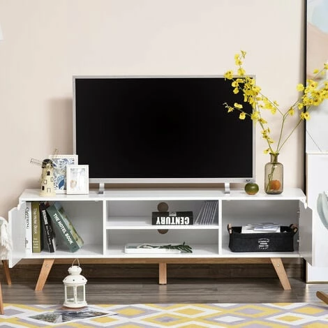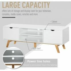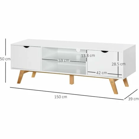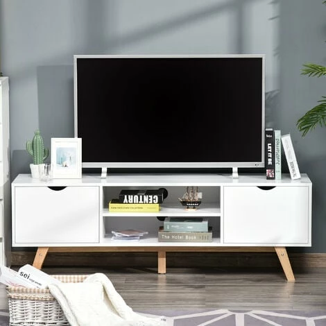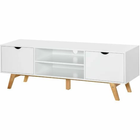 Bring minimal elegance into your home for maximum impact, thanks to this TV table from HOMCOM. Using a blend of particle board and MDF for the frame, it is crafted into a space-utilising design, featuring two end cabinets and two middle compartments, providing plenty of open and discreet room for media unit and electronics. A rubber wood base provides balance and stability, and this entertainment unit is finished with a spacious worktop and cable holes on the back.