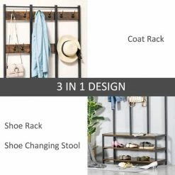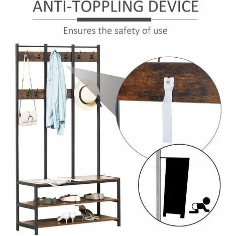 Keep your coats, outerwear, bags and shoes well organized with our industrial hall tree shoe bench from HOMCOM. This garment rack with 12 hooks for hanging your coat and 3-tier shoe stool for placing shoes or offering seat when changing your shoes. Crafted from particle board with metal frame, it is durable in use. Equipped with anti-toppling device, it will be stable and safe. Buy it and you’ll never misplace anything again!