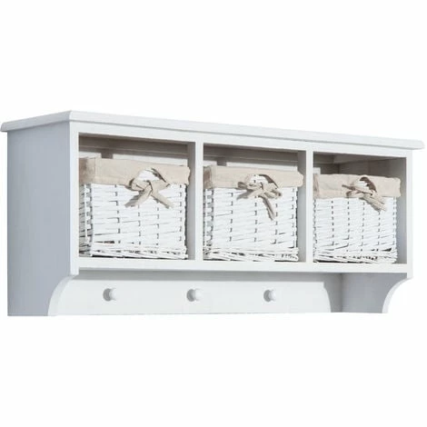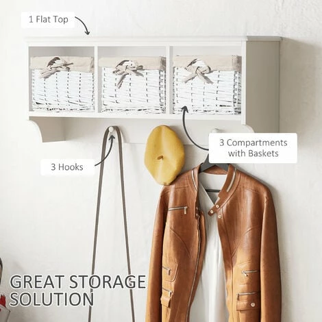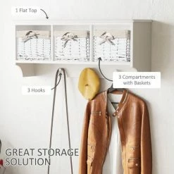 This HOMCOM wall mounted storage shelf is a great item to have in your entry or hallway for your home or office. It comes in a modern design with three wood hooks to hang your coats and three cube shelves with two pullout wicker baskets. These will be a great place to store your gloves, scarves bags and more. The unit gives you ample storage and will be an ideal solution to match your home or office décor.
