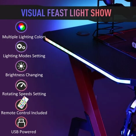 High-performance gaming needs a high-performance gaming desk. Come with spacious desktop, stable powder-coated steel frame, built-in RGB LED lighting, and versatile storage solution, this gaming desk provides everything you need for high-performance gaming. Ergonomically contoured edges and attached protective levers enhance the comfort of long hours of play in your gaming office.