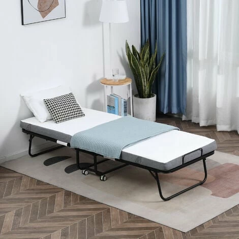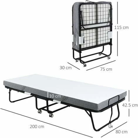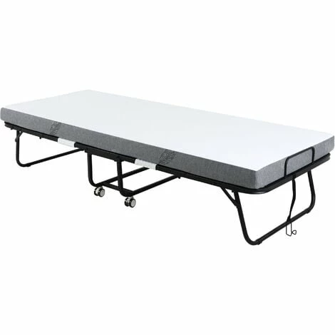 Last minute overnight guests? No problem. This HOMCOM wheeled single bed is so easy to move and gives you a restful sleep, wherever it stays. The metal frame is strong, with the four long legs giving balance. It comes with a top mattress – 10cm thick and soft, it will keep you comfortable with just the right amount of support. Four wheels on the base mean you can move it around easily from room to room – two lock into place so no moving once ready. And when done, simply fold in half to store.