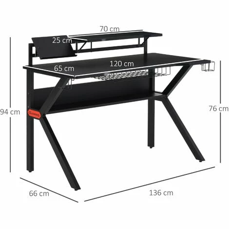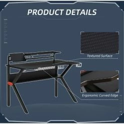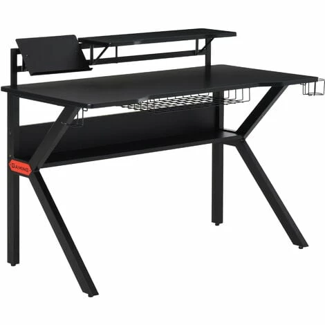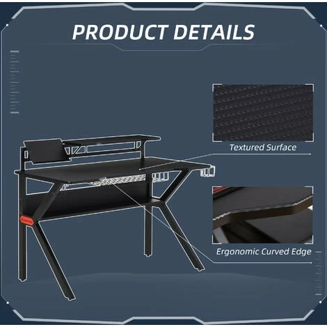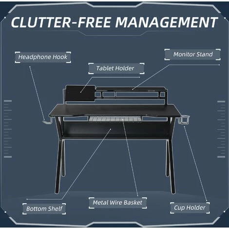 • Design incorporates a large main worktop, a bottom storage shelf, a top for your monitor, a slanted tablet holder, a cup holder and a headphone hook