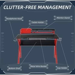 • Design incorporates a large main worktop, a bottom storage shelf, a top for your monitor, a slanted tablet holder, a cup holder and a headphone hook