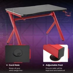 A snazzy upgrade for your gaming room comes in the form of this table from HOMCOM. It comes with two LED light strips on both sides creates a fun atmosphere in the dark – seven colours controlled by the included remote. The worktop is large for plenty of playing/working room, with the textured surface making it safely anti-slip. Steel frame for a supportive core structure, comes with adjustable feet for continual balance. Finished with a handy cup holder and headphone hook.