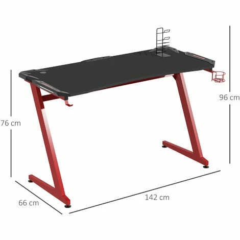 • Dimensions: 96H x 142L x 66Wcm. Tabletop to floor: 76cm. Distance between legs: 126cm. Cup holder: 6H x Φ11cm. Gamepad holder: 20H x 8.5W x 12Dcm