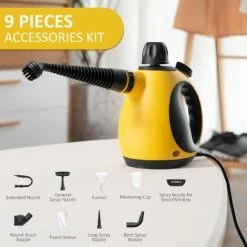 ● Nine pieces included: funnel, water funnel, extension nozzle, spray nozzle, spray nozzle for doors/windows, long spray nozzle, round brush nozzle, bent spray nozzle and towel sleeve.● Chemical free and safe around kids and pets (too not leave steam unattended)