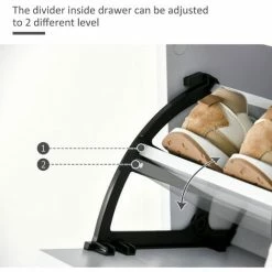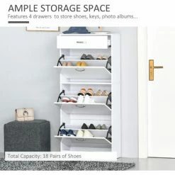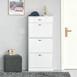 Choose this cabinet from HOMCOM will keep your home tidy. There are three flip drawers, each can hold six pairs – perfect for use with the family or your flatmates. The inner shelf can be set to two different positions for storage which fits your shoes better. Finished with a handy top drawer, offering even more storage. Made of particle board frame with gloss panel and aluminium handle, it is durable for everyday use. The high gloss storage unit in modern style is a great addition to your home.